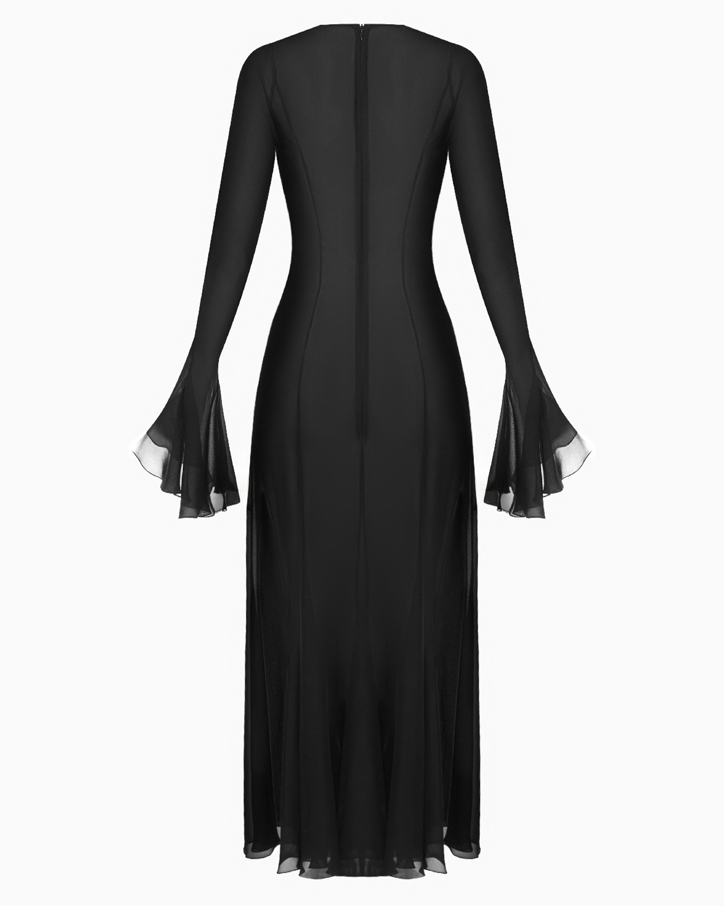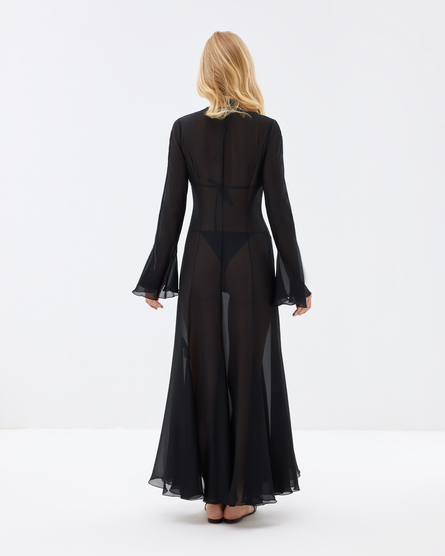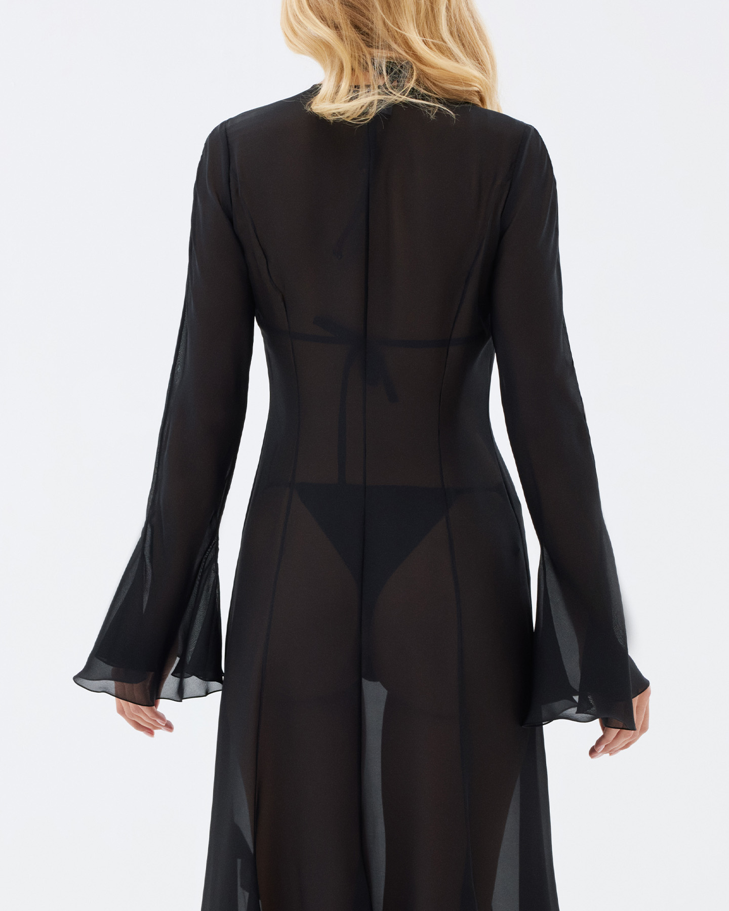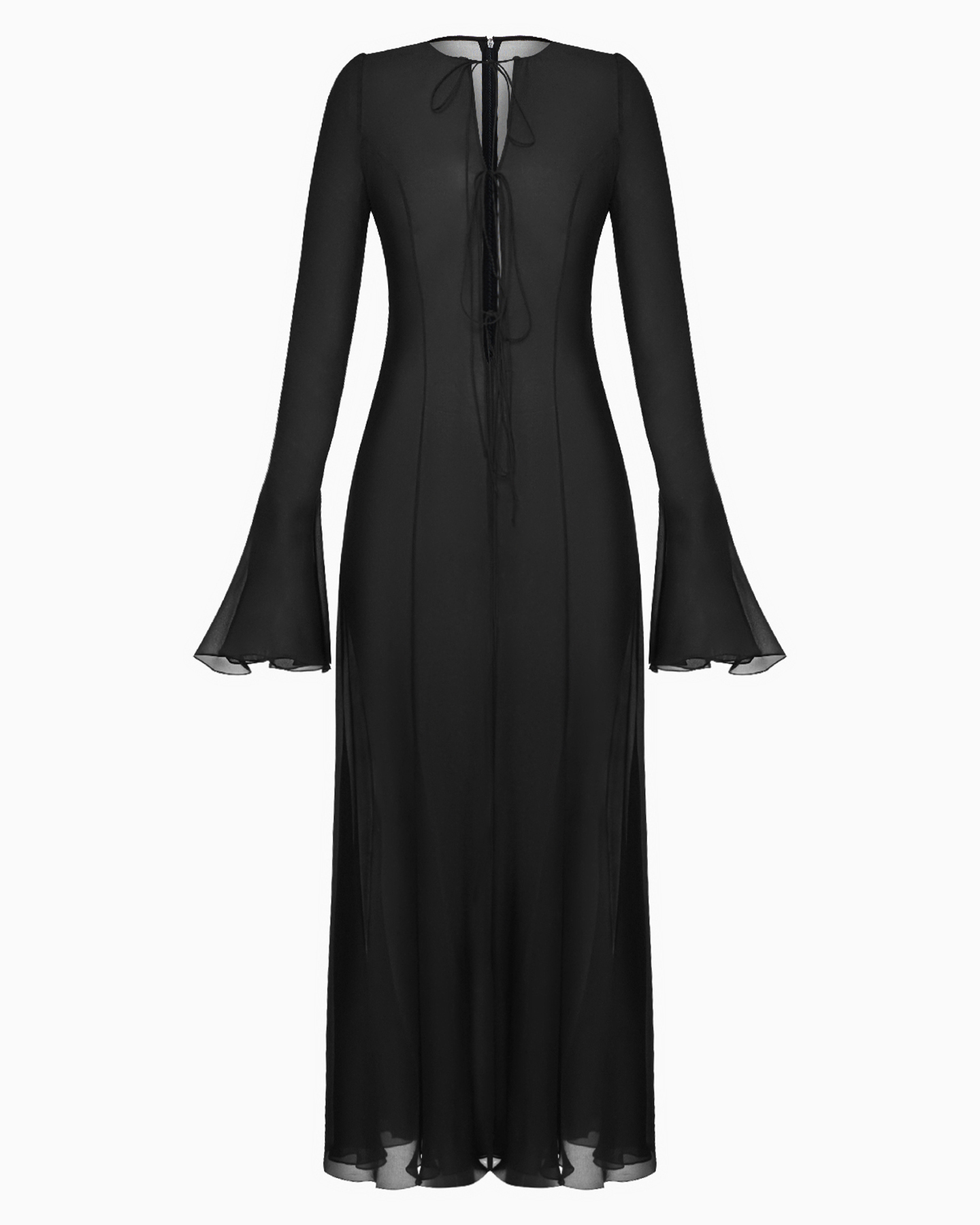 Платье из шелка с удлиненными рукавами и завязками на спине.